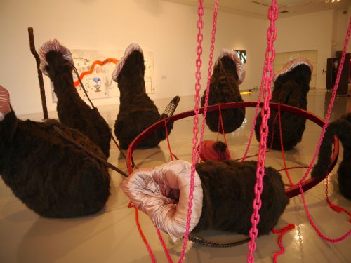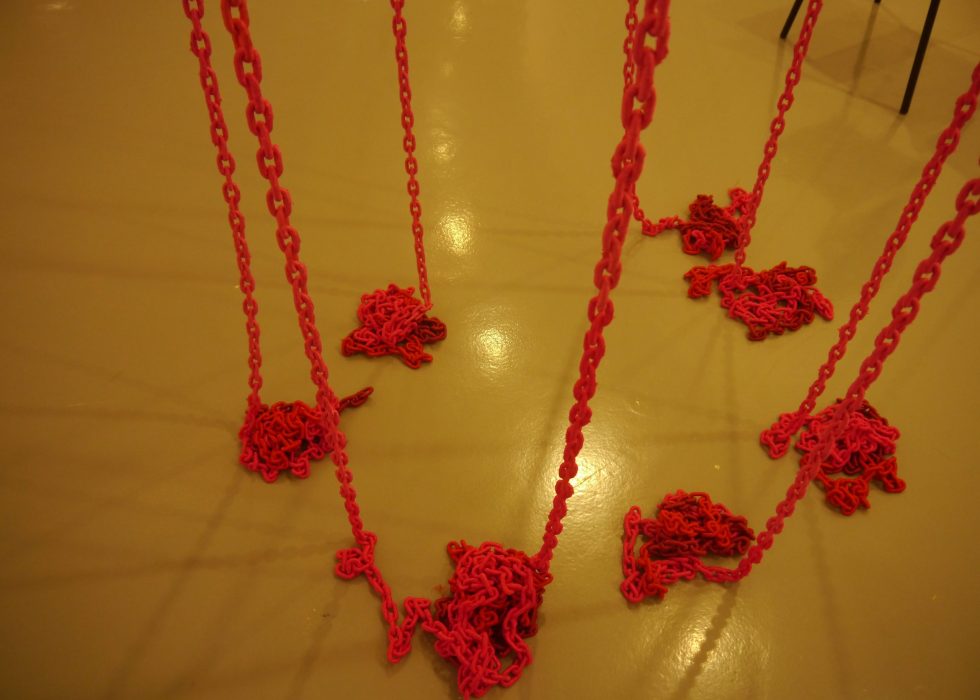 The concept of a baroque chandelier swinging precariously from the ceiling soon grew into a hairy monkey-like pot, twice the height of the gallery’s ceiling, displaying soft beautiful chain linked to the grotesque lips/orifices of the pitcher plant to entice and revolt.