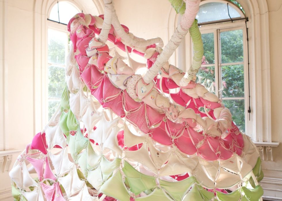 My installations range from a giant pink satin and fur chandelier crashing to the ground, taking on the form of a monkey’s cooking pot, to a delicate life-size child’s swing inviting play, made up of plastic sweets, to an immersive installation of oil paintings comprising the 32 pieces of a chess set, each representing a significant archetype in my life.