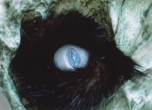 This sculpture was inspired by nuns in Rome pushing trolleys filled with nicknacks around a religious supermarket. The eyes were made from animal tails which came from a sack outside a shop nearby and the ‘pupils’ were made from pendants from the supermarket.