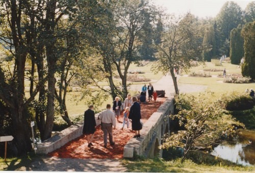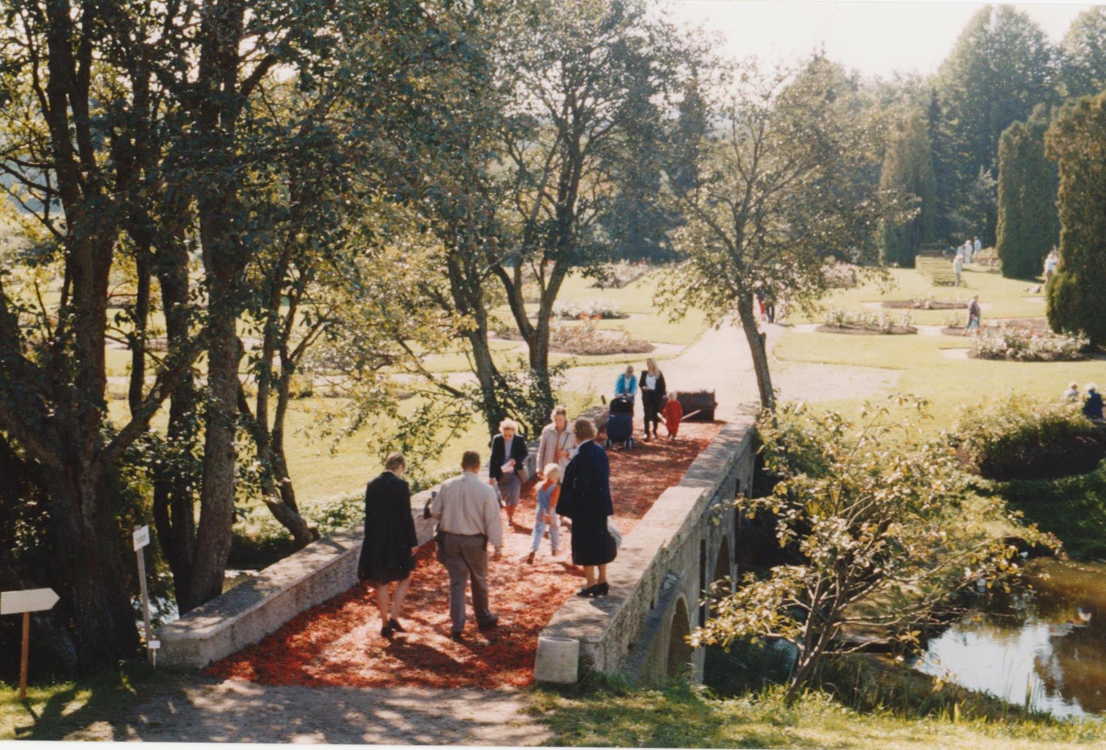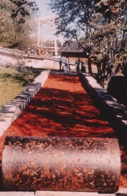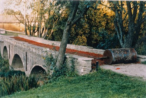 This worn out looking carpet across a bridge in the Botanical Gardens, Tallinn, Estonia, was made out of crushed rowan berries, a symbol of creative energy. The berries were collected from the woods by hundreds of local school children. At dawn the carpet was covered in frogs and wagtails.