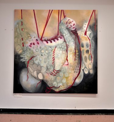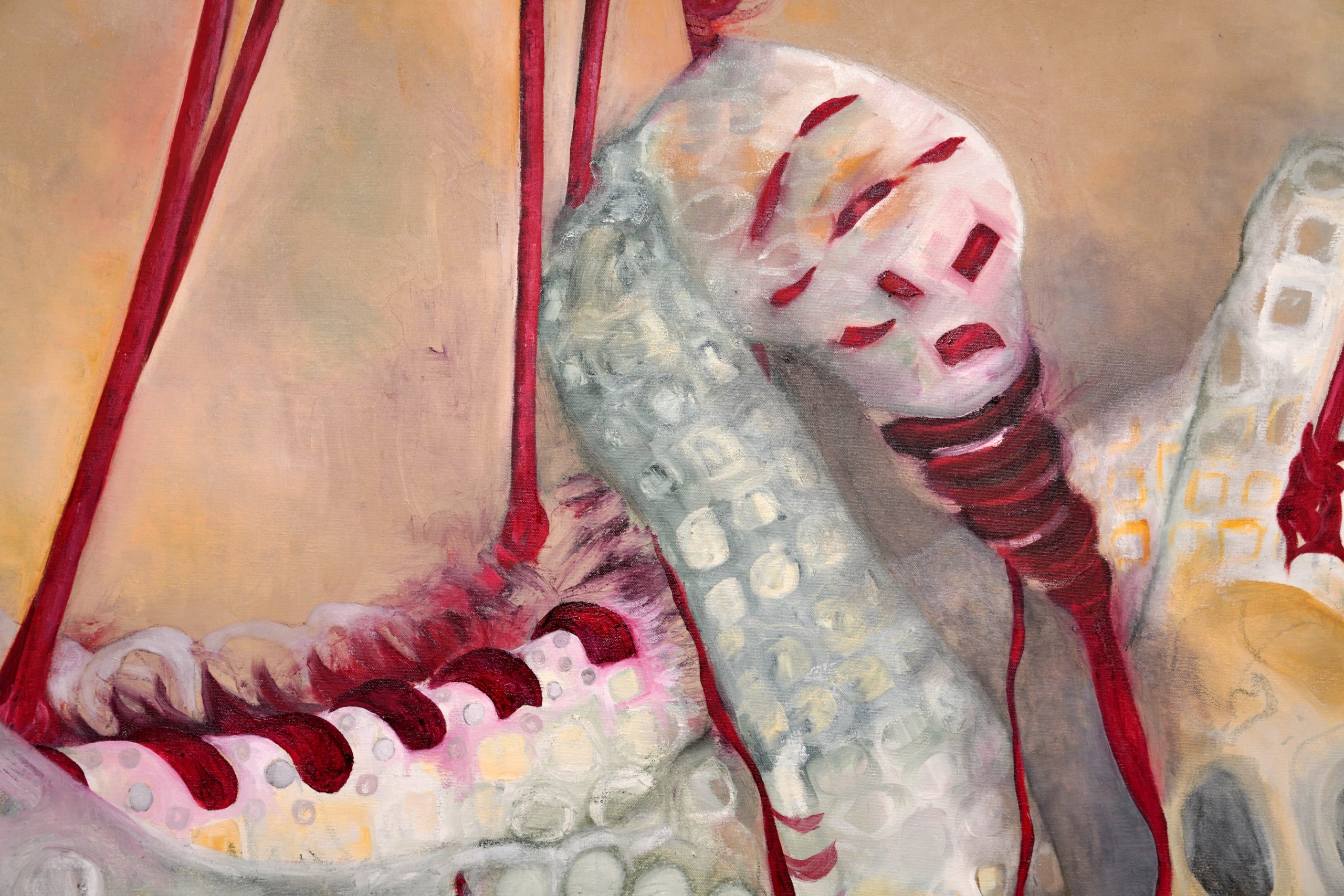 The painting emerges from this slow, interconnected flow of thought and making. It imagines a dancer, Leda, taunting the suspended swan tethered to the harbour wall, immersed by tides, witness to the charged stillness of the end.